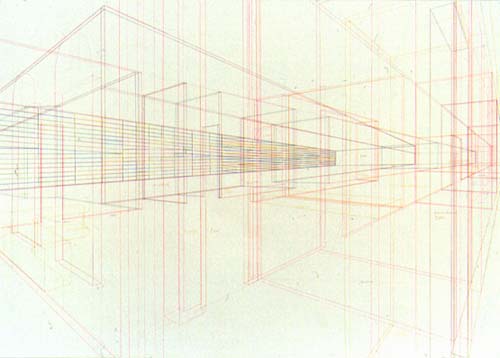 Silke SchatzKonzerthaus Erdgeschoß II1999vanishing point studycolor and lead pencil on paper39 1/4 x 55 in.at Sikkema