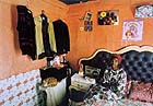Zwelethu's subjects have an estimable air of downtrodden regality. They live in Capetown huts, incredibly wallpapered with sheets of newspapers, labels from canned goods and even movie posters, a scene characteristic of South Africa's urban geography. His photos are antithetical to the popular images generated by news reporting and his vibrato color resonates vividly in a medium that is sociologically based. Mthethwa is concerned with composition, hierarchy, costuming, interiors and the descriptive. He is an enunciator of the infernal.
