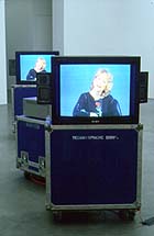 In the large middle gallery is Armleder's huge installation Mondo Tiki 1 (1999), a wooden plank scaffolding (with steps to climb) fitted with fluorescent tubes, siren lights, televisions screening sci-fi B movies and small boom boxes playing a compilation of Polynesian pop songs. You can stand at the top of this structure about 15 feet from the floor and look around the space. One side of the room is bathed in neon pink from flashing rows of ring-shaped lights, another wall is covered with a pattern of half-domed surveillance mirrors and a third wall is covered with a field of ellipse-shaped targets painted in red and blue latex. The mishmash works through and through, for an elegant disparity that as a whole is flawless.