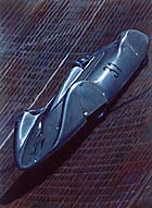 57th Street Lawrence Gipe makes paintings of images from the military-industrial complex, gathering source material from World War II military propaganda and advertising from the era. The machines he portrays are sleek, fast and sinister, right out of a Fritz Lang film. A throwback to another time, Gipe gives a somewhat romantic air to his heroic imagery whether its an automobile, airplane or rushing train. On view at Joseph Helman gallery is a recent canvas titled The Components of Fear #3 (1999) that shows a 1937 experimental car built by Porsche. The silvery machine from the future seems to be running on a curvy race track, and is sold for a throttling $18,000.