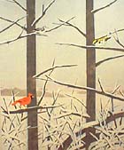 It is summer and summer means group shows of new talent. The exhibition at Friedrich Petzel Gallery features several interesting works. The painting that caught my eye shows three colorful birds, apparently copied from a simple guidebook, positioned in tree branches in a gray winter landscape. It's by Roger White, who someone told me was a second-year MFA student at Columbia. The painting is $3,000.